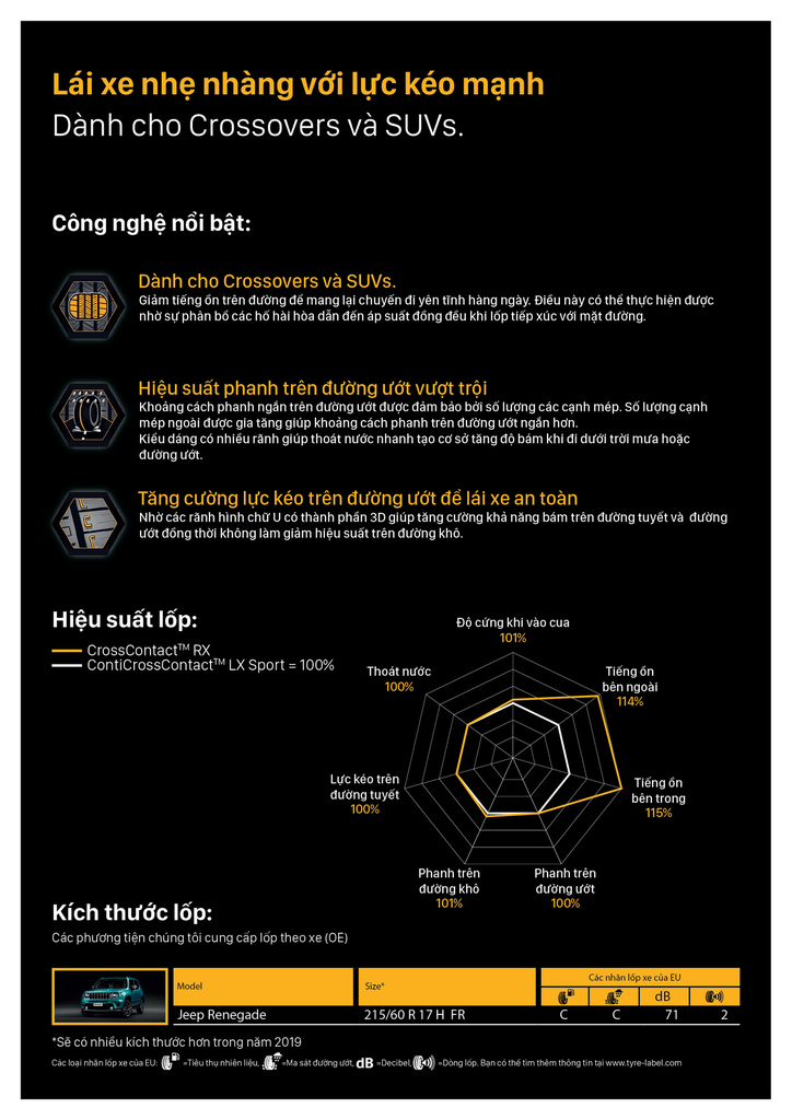Dưới đây là các thông số kỹ thuật của lốp Continental CrossContact RX dành cho các dòng xe SUV/Pickup